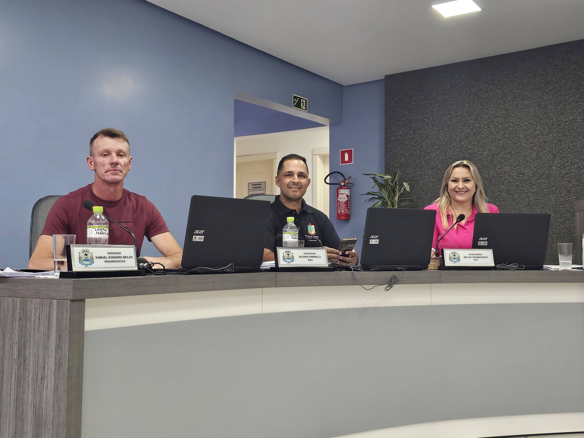 O vereador Diego Acassio Bock (PP) não esteve presente na Sessão, pois cumpria agenda em Porto Alegre, relacionada à entrega de um rolo compactador ao município. O equipamento foi viabilizado por meio de emenda intermediada pelo parlamentar, do Progressistas, com apoio do deputado estadual Afonso Hamm. Com isso a mesa diretora ficou composta por três vereadoras mulheres: Drika, Maria Lúcia e Élia Maria.